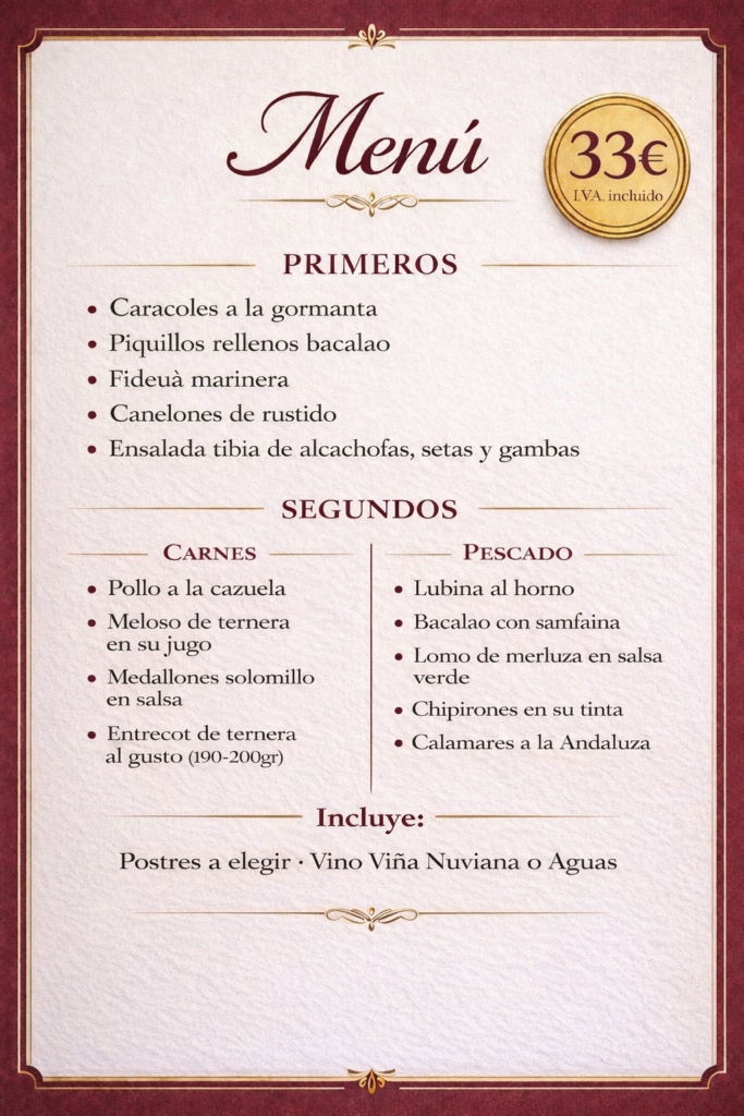 Disfruta de los caracoles a la gormanta en nuestro menú especial de fin de semana, podrás elegir entre varias opciones de primeros, segundos y postres.